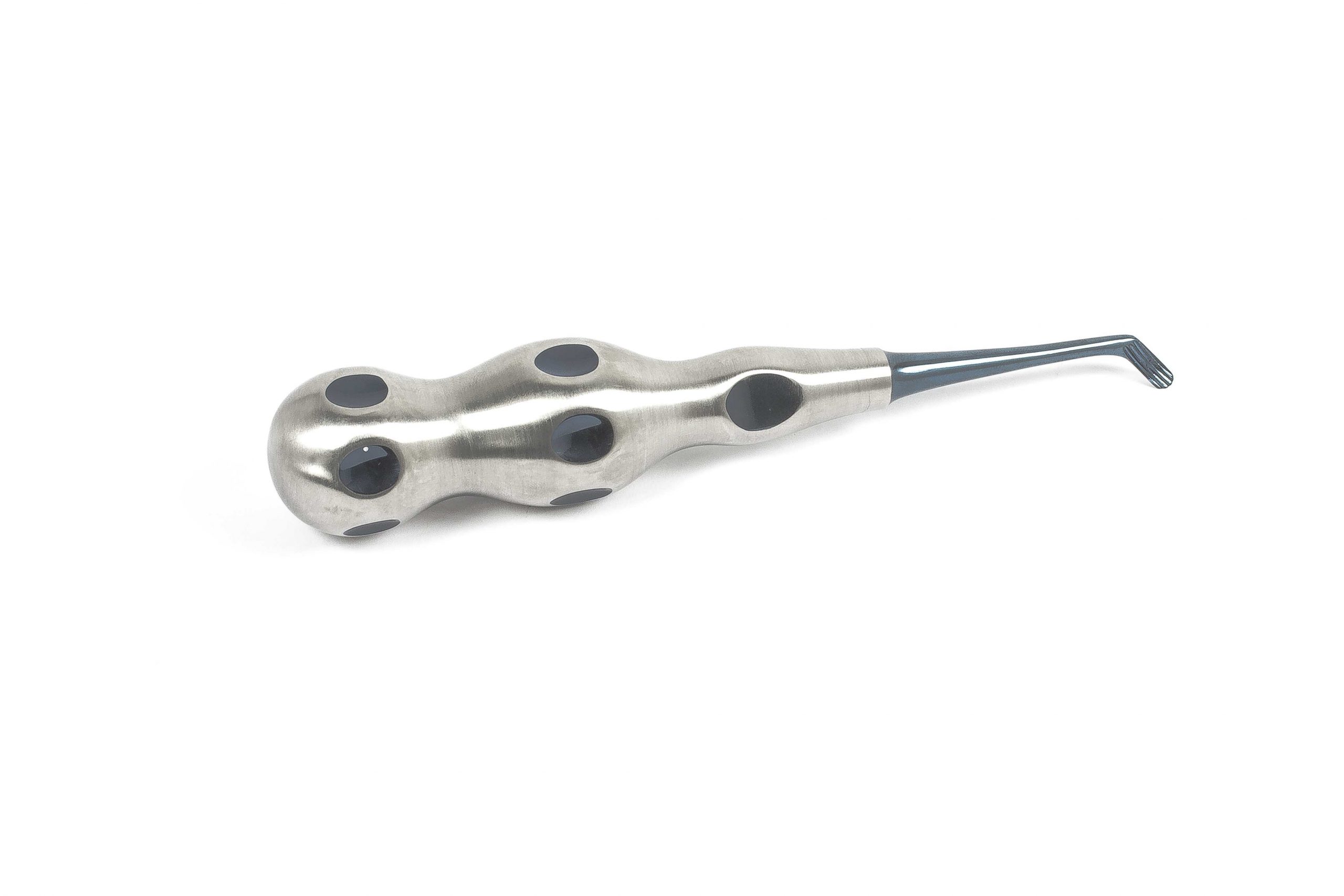 Угловой байонетный дизайн: Специальная форма рабочего конца инструмента позволяет легко и точно маневрировать в ограниченных пространствах, что особенно важно при удалении зубов с правой стороны челюсти. Угол наклона обеспечивает оптимальный доступ к зубам и корням.