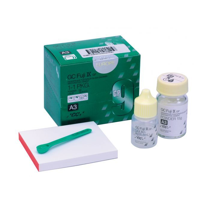 GC Fuji IX GP — рентгеноконтрастный стеклоиономерный цемент химического отверждения для постоянных реставраций. Обладает высокой прочностью, низкой истираемостью и способностью выделять фтор. Предназначен для реставраций класса I, II у взрослых, V класса и молочных зубов.