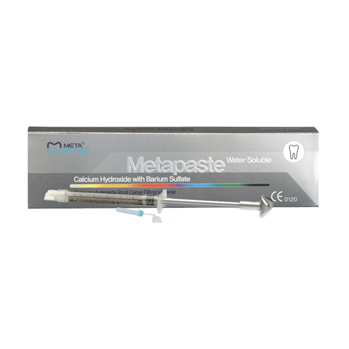 Metapaste — готовая к применению паста для эндодонтического лечения. Состав включает гидроксид кальция, обеспечивающий формирование твердотканевого барьера и стимуляцию апексогенеза. Размер упаковки: 155×175 мм. Основной цвет упаковки: INDIGO 2767C. Материал обладает высокой рентгеноконтрастностью для контроля качества обтурации.